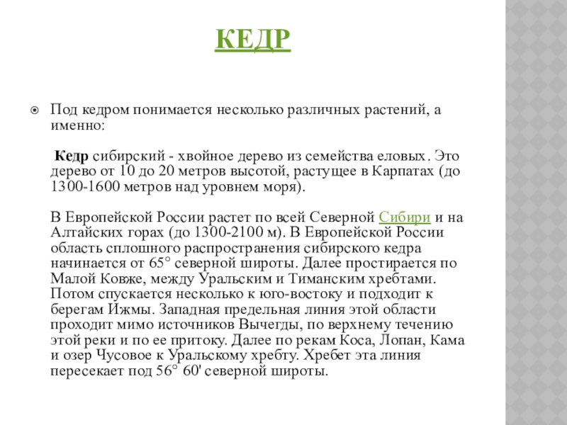 В Европейской России растет по всей Северной Сибири и на Алтайских горах (до 1300-2100 м). В Европейской России область сплошного распространения сибирского кедра начинается от 65° северной широты. Далее простирается по Малой Ковже, между Уральским и Тиманским хребтами. Потом спускается несколько к юго-востоку и подходит к берегам Ижмы. Западная предельная линия этой области проходит мимо источников Вычегды, по верхнему течению этой реки и по ее притоку. Далее по рекам Коса, Лопан, Кама и озер Чусовое к Уральскому хребту. Хребет эта линия пересекает под 56° 60' северной широты.
