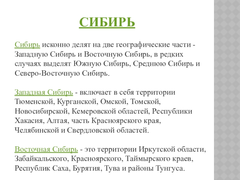 Западная Сибирь - включает в себя территории Тюменской, Курганской, Омской, Томской, Новосибирской, Кемеровской областей, Республики Хакасия, Алтая, часть Красноярского края, Челябинской и Свердловской областей.