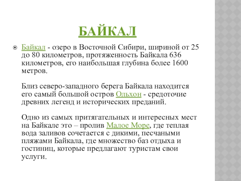 Байкал - озеро в Восточной Сибири, шириной от 25 до 80 километров,