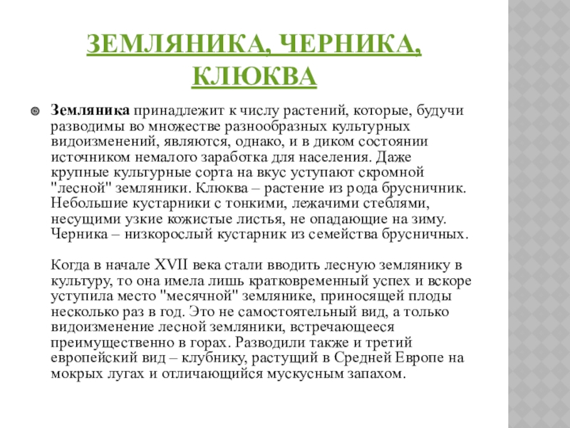 разнообразных культурных видоизменений, являются, однако, и в диком состоянии источником немалого заработка для населения. Даже крупные культурные сорта на вкус уступают скромной "лесной" земляники. Клюква – растение из рода брусничник. Небольшие кустарники с тонкими, лежачими стеблями, несущими узкие кожистые листья, не опадающие на зиму. Черника – низкорослый кустарник из семейства брусничных.