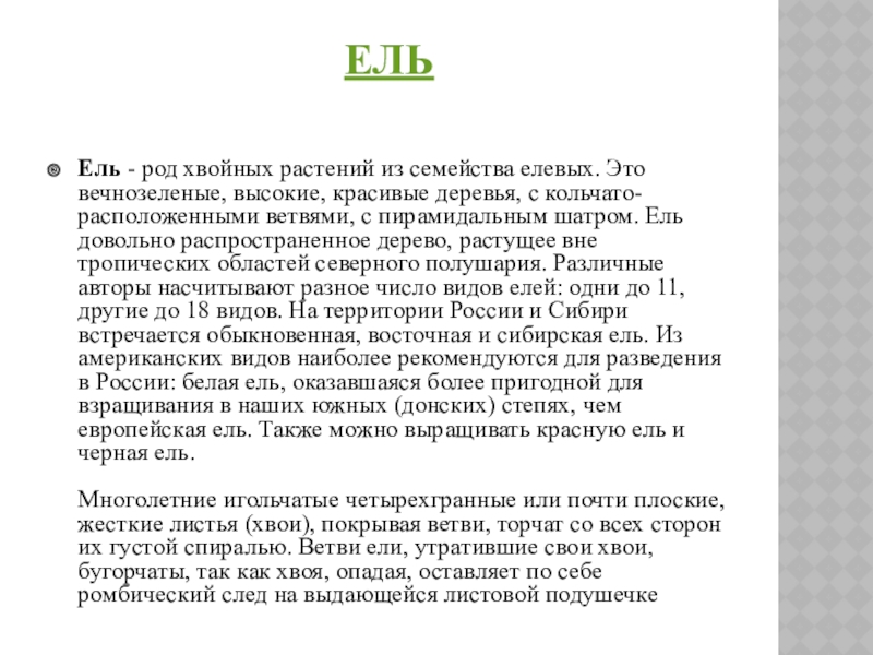 деревья, с кольчато-расположенными ветвями, с пирамидальным шатром. Ель довольно распространенное дерево, растущее вне тропических областей северного полушария. Различные авторы насчитывают разное число видов елей: одни до 11, другие до 18 видов. На территории России и Сибири встречается обыкновенная, восточная и сибирская ель. Из американских видов наиболее рекомендуются для разведения в России: белая ель, оказавшаяся более пригодной для взращивания в наших южных (донских) степях, чем европейская ель. Также можно выращивать красную ель и черная ель.