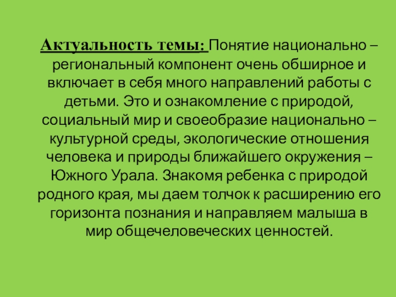 Актуальность темы: Понятие национально – региональный компонент очень обширное и включает в себя много направлений работы с