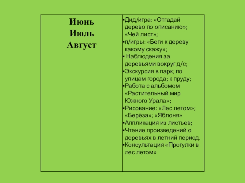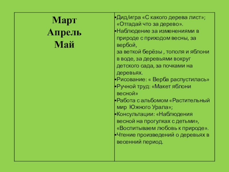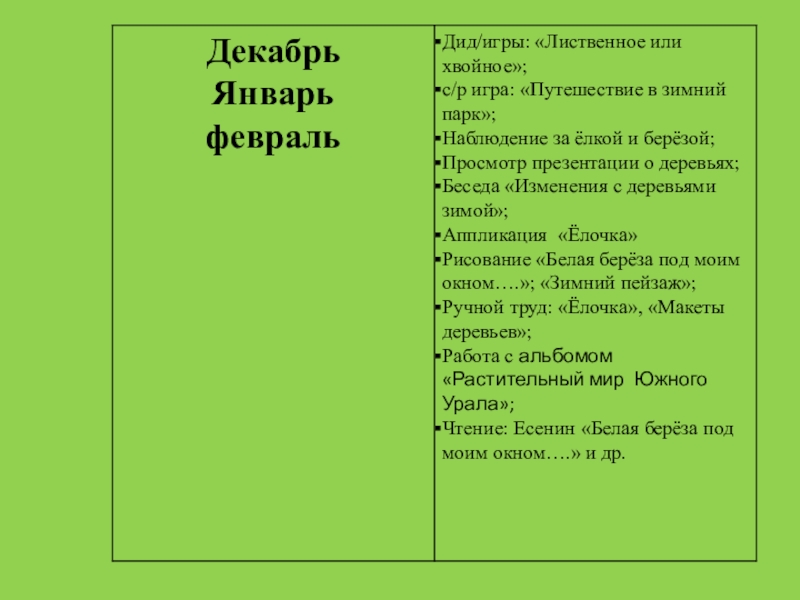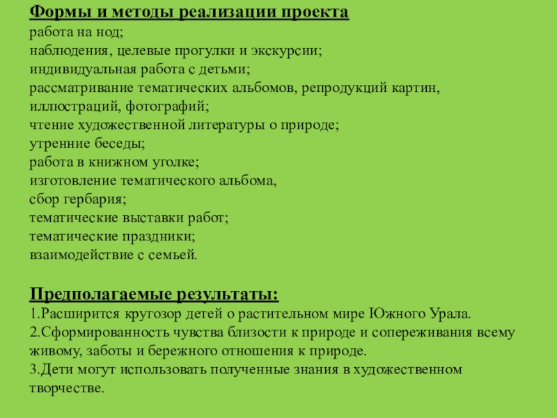индивидуальная работа с детьми; рассматривание тематических альбомов, репродукций картин, иллюстраций, фотографий; чтение художественной литературы о природе; утренние беседы; работа в книжном уголке; изготовление тематического альбома, сбор гербария; тематические выставки работ; тематические праздники; взаимодействие с семьей.   Предполагаемые результаты: 1.Расширится кругозор детей о растительном мире Южного Урала. 2.Сформированность чувства близости к природе и сопереживания всему живому, заботы и бережного отношения к природе. 3.Дети могут использовать полученные знания в художественном творчестве.