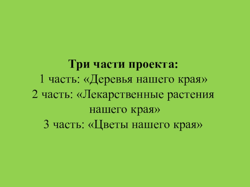 Слайд 8Три части проекта: 1 часть: «Деревья нашего края» 2 часть: «Лекарственные растения нашего