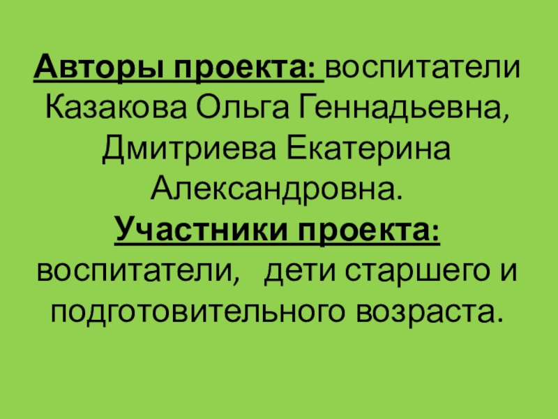 Слайд 2Авторы проекта: воспитатели Казакова Ольга Геннадьевна, Дмитриева Екатерина Александровна. Участники проекта: воспитатели,