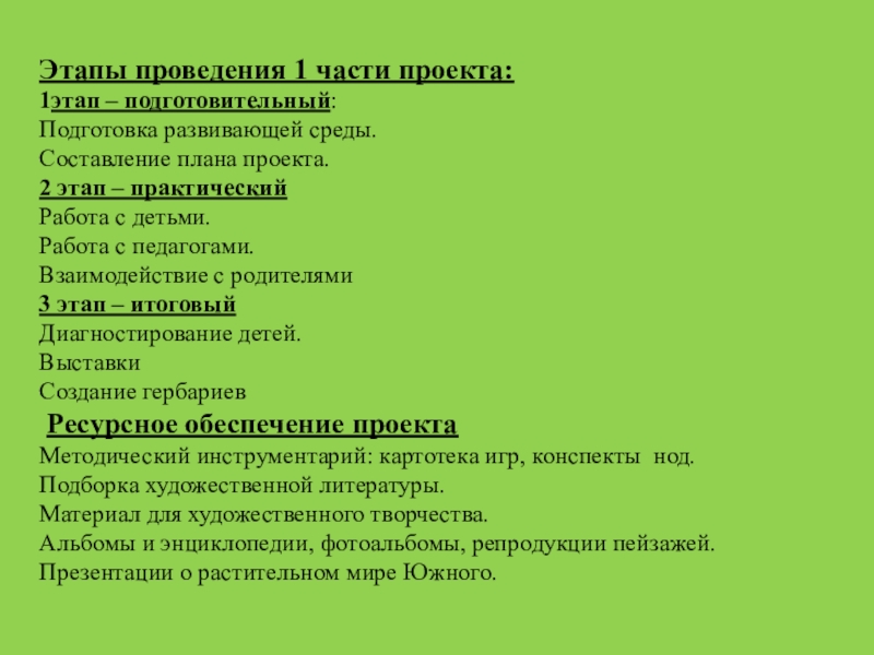 этап – практический Работа с детьми. Работа с педагогами. Взаимодействие с родителями 3 этап – итоговый Диагностирование детей. Выставки Создание гербариев  Ресурсное обеспечение проекта Методический инструментарий: картотека игр, конспекты нод. Подборка художественной литературы. Материал для художественного творчества. Альбомы и энциклопедии, фотоальбомы, репродукции пейзажей. Презентации о растительном мире Южного.