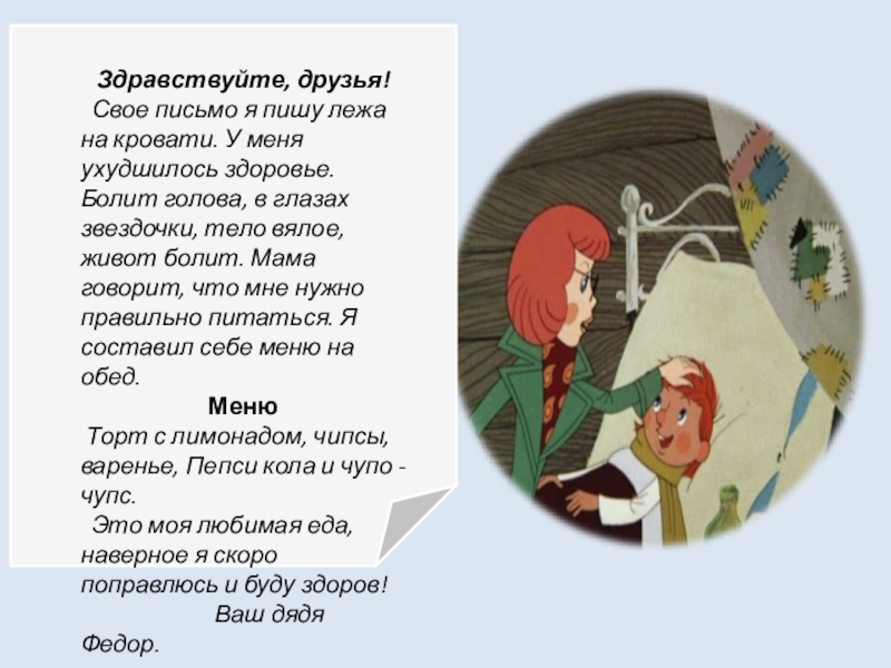 Здравствуйте, друзья!  Свое письмо я пишу лежа на кровати. У меня ухудшилось здоровье. Болит голова, в