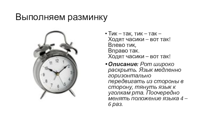 Описание: Рот широко раскрыть. Язык медленно горизонтально передвигать из стороны в сторону, тянуть язык к уголкам рта. Поочередно менять положение языка 4 – 6 раз.
