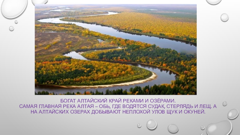 где водятся судак, стерлядь и лещ. А на алтайских озерах добывают неплохой улов щук и окуней.