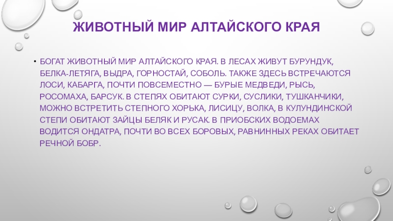 белка-летяга, выдра, горностай, соболь. Также здесь встречаются лоси, кабарга, почти повсеместно — бурые медведи, рысь, росомаха, барсук. В степях обитают сурки, суслики, тушканчики, можно встретить степного хорька, лисицу, волка, в Кулундинской степи обитают зайцы беляк и русак. В приобских водоемах водится ондатра, почти во всех боровых, равнинных реках обитает речной бобр.