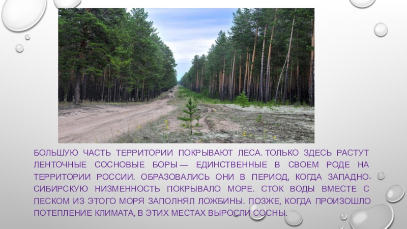 Слайд 5Большую часть территории покрывают леса. Только здесь растут ленточные сосновые боры — единственные