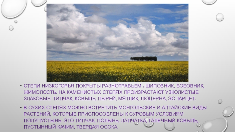Слайд 10Степи низкогорья покрыты разнотравьем : шиповник, бобовник, жимолость. На каменистых степях