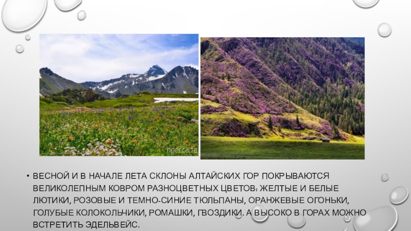 Слайд 9Весной и в начале лета склоны алтайских гор покрываются великолепным ковром