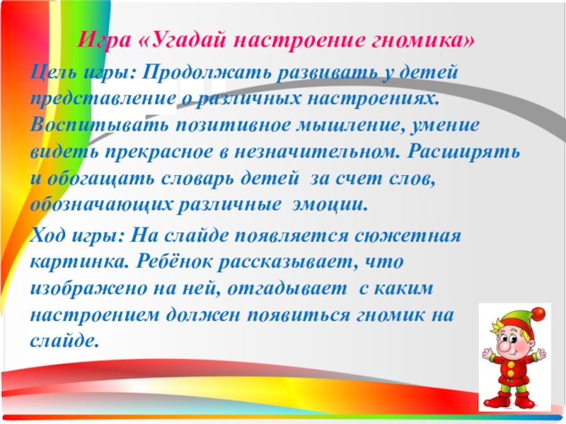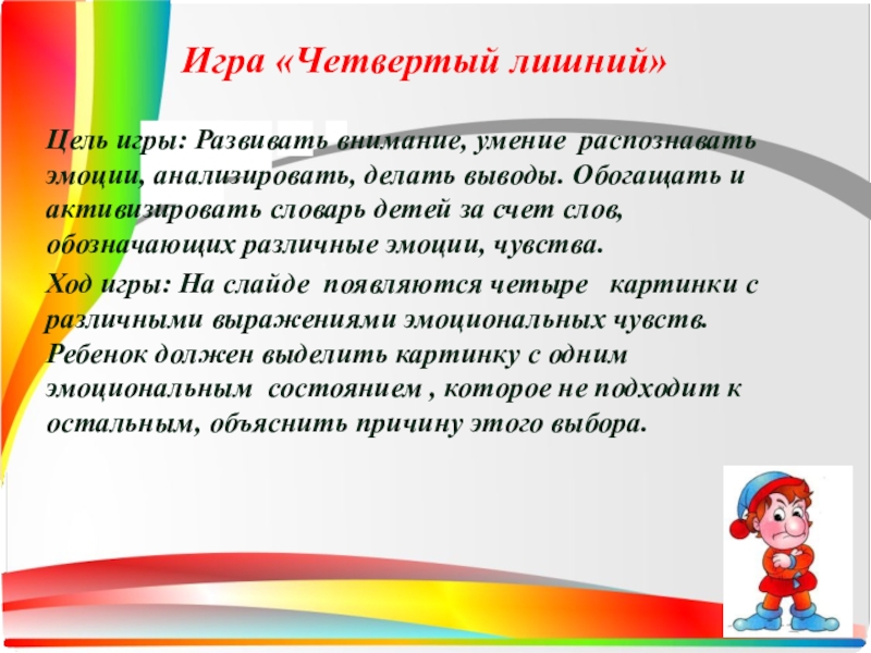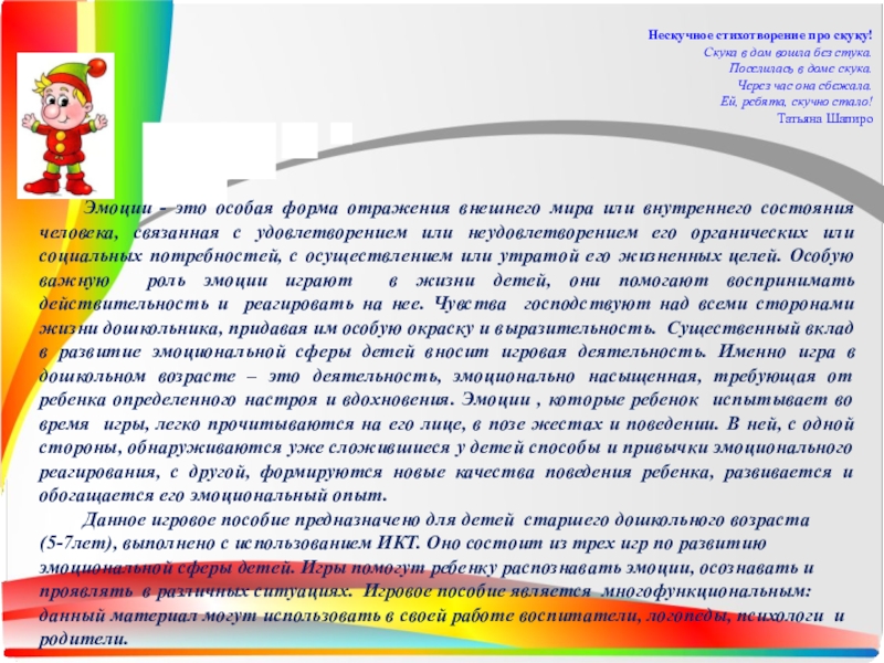 Данное игровое пособие предназначено для детей старшего дошкольного возраста (5-7лет), выполнено с использованием ИКТ. Оно состоит из трех игр по развитию эмоциональной сферы детей. Игры помогут ребенку распознавать эмоции, осознавать и проявлять в различных ситуациях. Игровое пособие является многофункциональным: данный материал могут использовать в своей работе воспитатели, логопеды, психологи и родители.