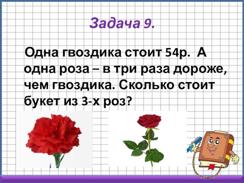 в три раза дороже, чем гвоздика. Сколько стоит букет из 3-х роз?