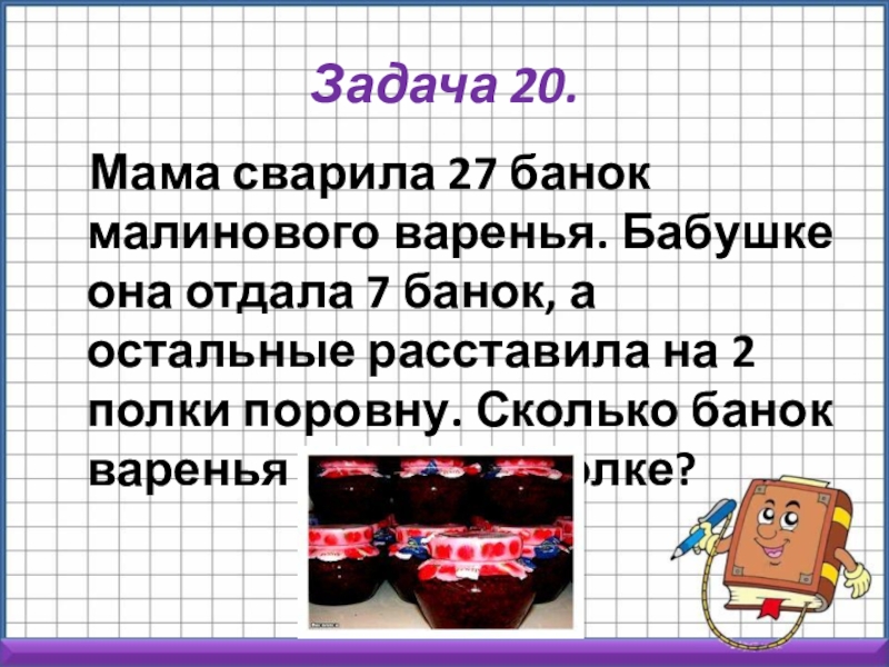 Мама сварила 27 банок малинового варенья. Бабушке она