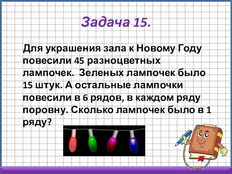 разноцветных лампочек. Зеленых лампочек было 15 штук. А остальные лампочки повесили в 6 рядов, в каждом ряду поровну. Сколько лампочек было в 1 ряду?