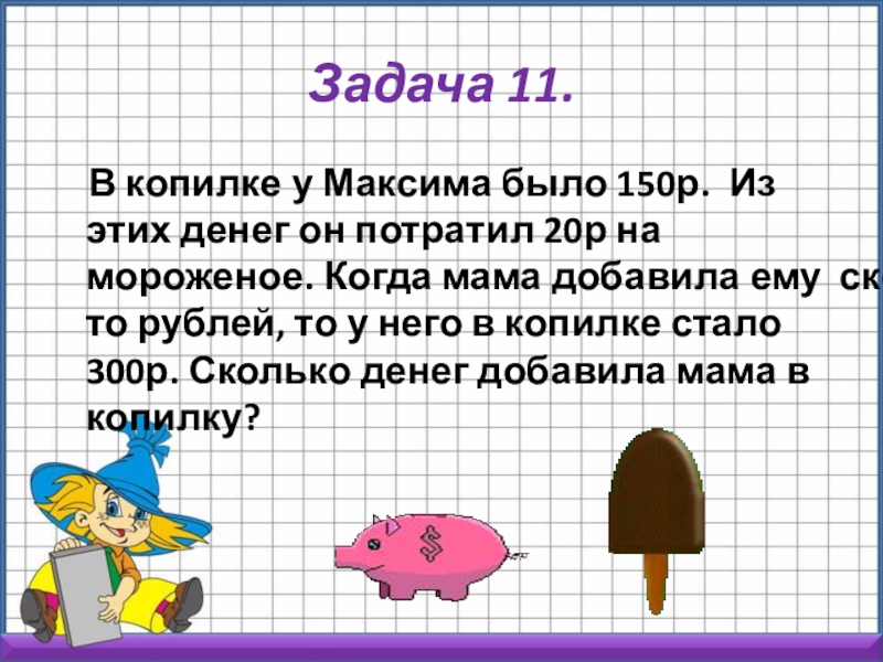 денег он потратил 20р на мороженое. Когда мама добавила ему сколько-то рублей, то у него в копилке стало 300р. Сколько денег добавила мама в копилку?