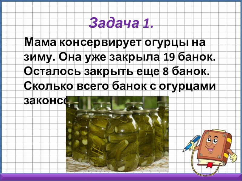 19 банок. Осталось закрыть еще 8 банок. Сколько всего банок с огурцами законсервирует мама?