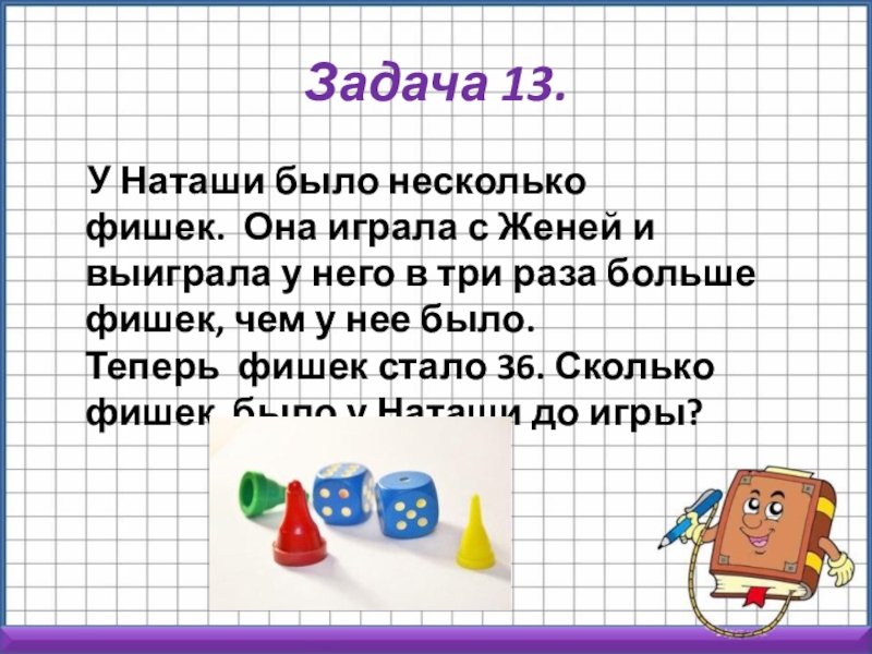 Женей и выиграла у него в три раза больше фишек, чем у нее было. Теперь фишек стало 36. Сколько фишек было у Наташи до игры?