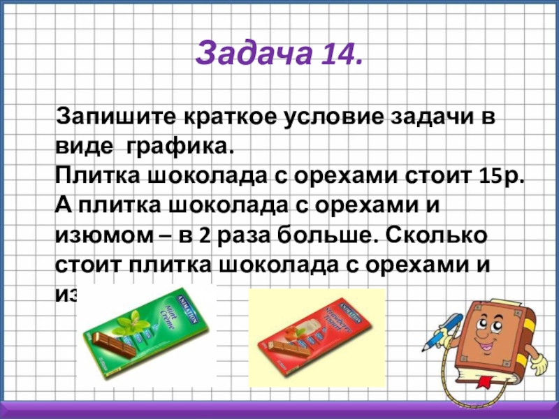 с орехами стоит 15р. А плитка шоколада с орехами и изюмом – в 2 раза больше. Сколько стоит плитка шоколада с орехами и изюмом?