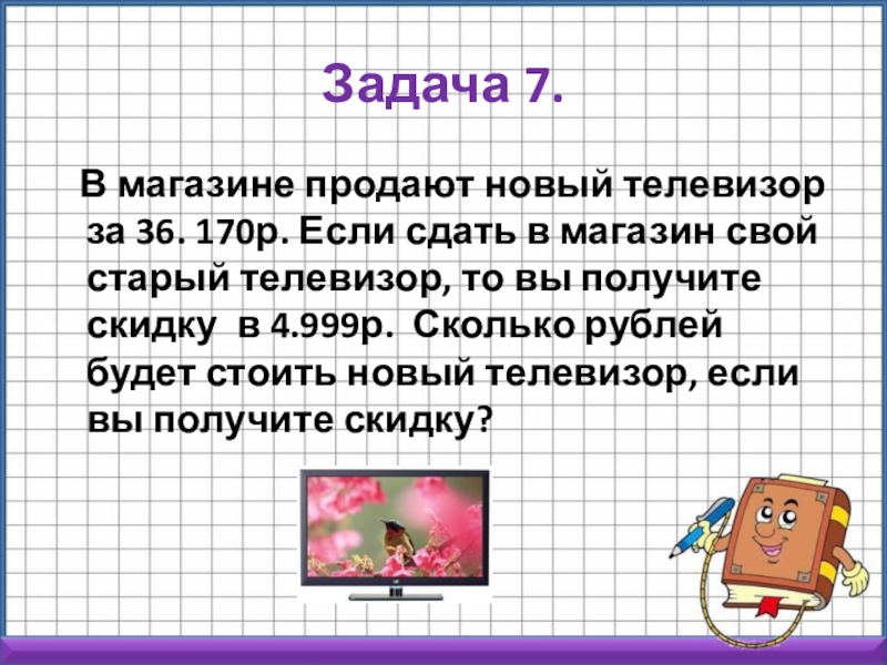 Если сдать в магазин свой старый телевизор, то вы получите скидку в 4.999р. Сколько рублей будет стоить новый телевизор, если вы получите скидку?