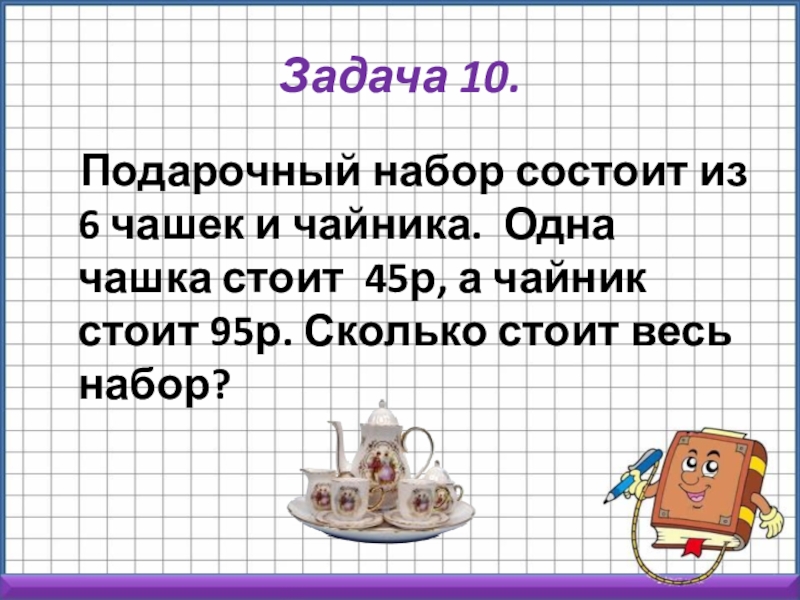 Одна чашка стоит 45р, а чайник стоит 95р. Сколько стоит весь набор?
