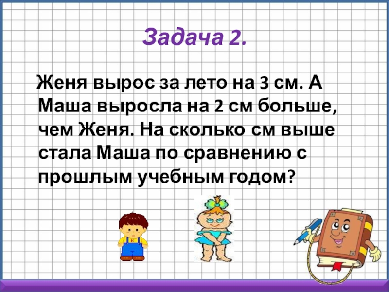Маша выросла на 2 см больше, чем Женя. На сколько см выше стала Маша по сравнению с прошлым учебным годом?