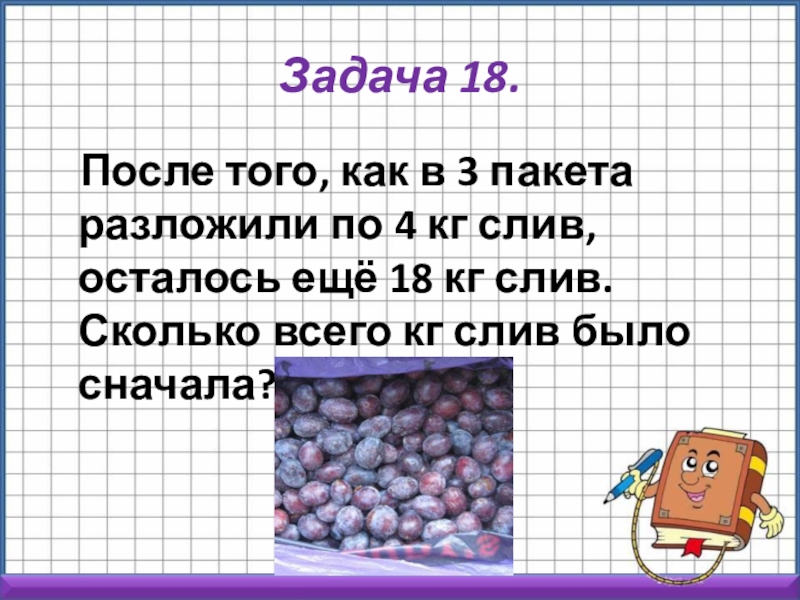 4 кг слив, осталось ещё 18 кг слив. Сколько всего кг слив было сначала?