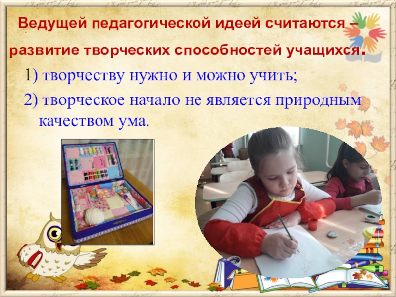 Ведущей педагогической идеей считаются – развитие творческих способностей учащихся.