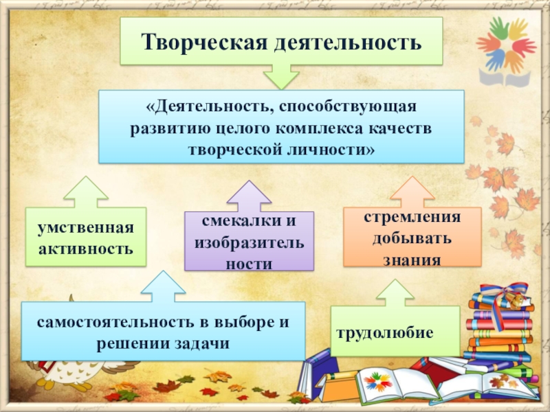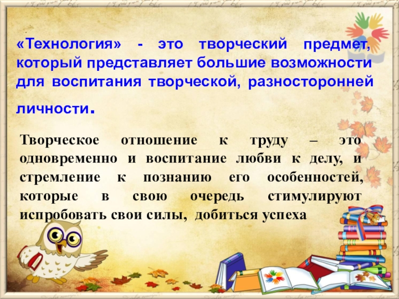 Творческое отношение к труду – это одновременно и воспитание любви к делу, и стремление к познанию его особенностей, которые в свою очередь стимулируют испробовать свои силы, добиться успеха