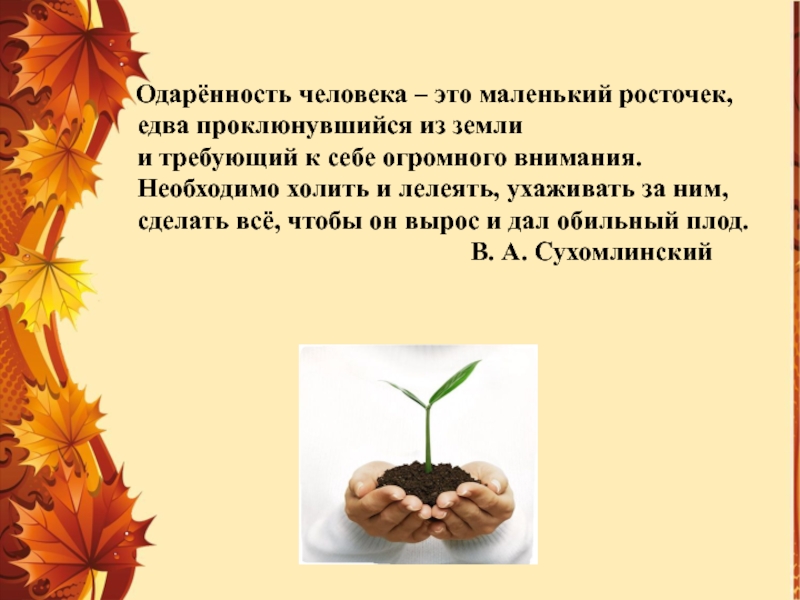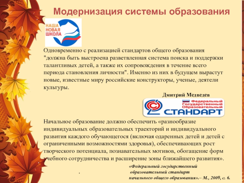 Одновременно с реализацией стандартов общего образования "должна быть выстроена разветвленная система поиска и поддержки талантливых детей, а также их сопровождения в течение всего периода становления личности". Именно из них в будущем вырастут новые, известные миру российские конструкторы, ученые, деятели культуры.