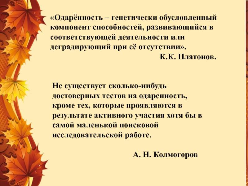 Не существует сколько-нибудь достоверных тестов на одаренность, кроме тех, которые проявляются в результате активного участия хотя бы в самой маленькой поисковой исследовательской работе.