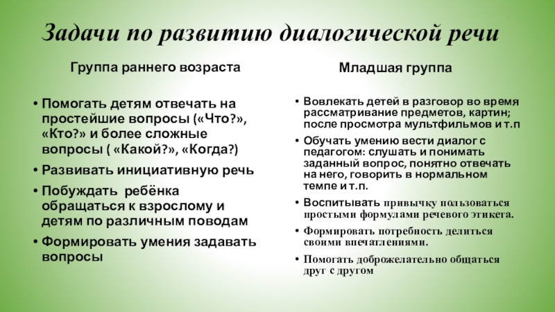 Обучать умению вести диалог с педагогом: слушать и понимать заданный вопрос, понятно отвечать на него, говорить в нормальном темпе и т.п.