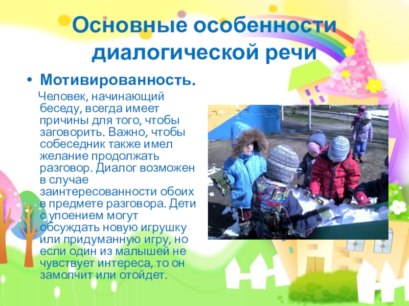 причины для того, чтобы заговорить. Важно, чтобы собеседник также имел желание продолжать разговор. Диалог возможен в случае заинтересованности обоих в предмете разговора. Дети с упоением могут обсуждать новую игрушку или придуманную игру, но если один из малышей не чувствует интереса, то он замолчит или отойдет.