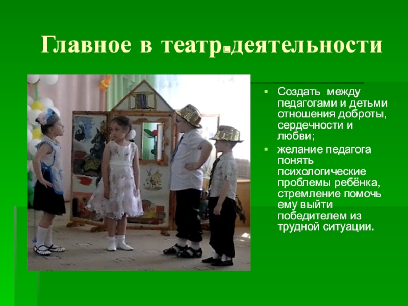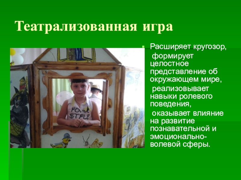 Тетрализованные игры являются одним из ведущих видов деятельности в дошкольном возрасте, определяющим развитие всех сторон личности ребенка и создающим «зону ближайшего развития» .