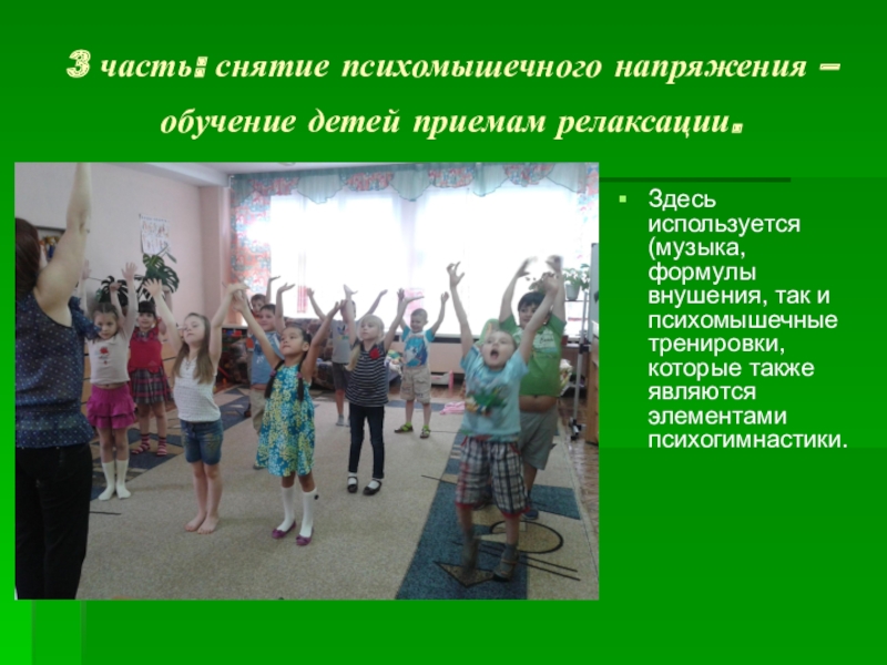 Слайд 233 часть: снятие психомышечного напряжения – обучение детей приемам релаксации.