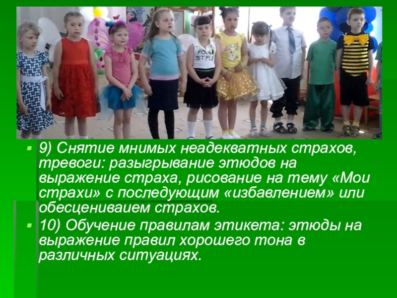 9) Снятие мнимых неадекватных страхов, тревоги: разыгрывание этюдов на выражение страха,