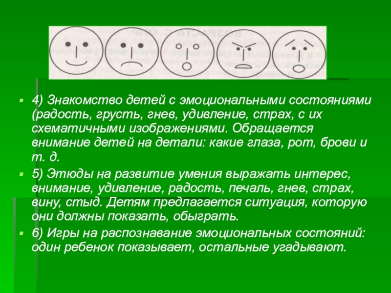 Слайд 114) Знакомство детей с эмоциональными состояниями (радость, грусть, гнев, удивление, страх,