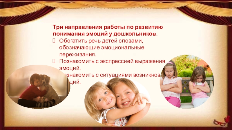 Слайд 9Три направления работы по развитию понимания эмоций у дошкольников.