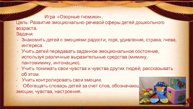 Цель: Развитие эмоционально-речевой сферы детей дошкольного возраста.