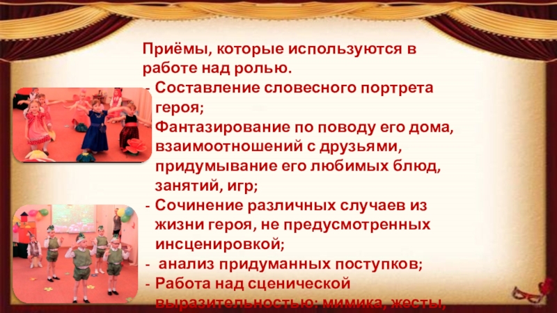 Слайд 16Приёмы, которые используются в работе над ролью.