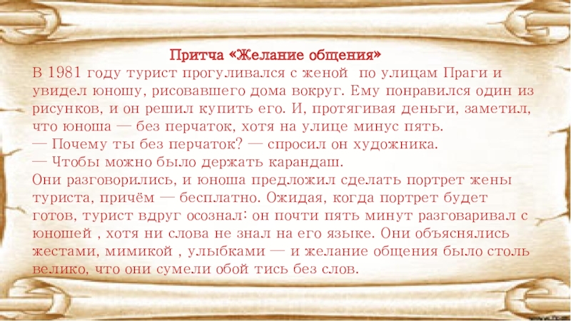 Они разговорились, и юноша предложил сделать портрет жены туриста, причём — бесплатно. Ожидая, когда портрет будет готов, турист вдруг осознал: он почти пять минут разговаривал с юношей, хотя ни слова не знал на его языке. Они объяснялись жестами, мимикой, улыбками — и желание общения было столь велико, что они сумели обойтись без слов.