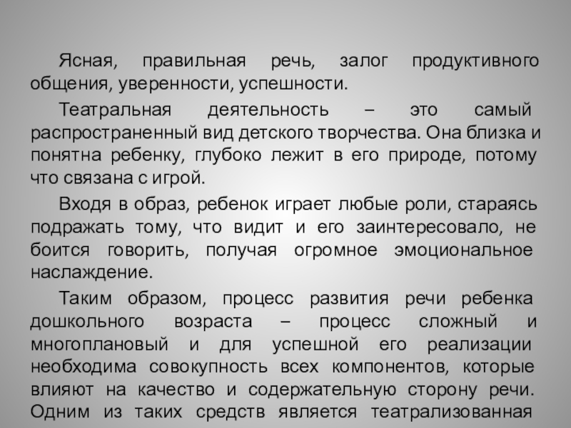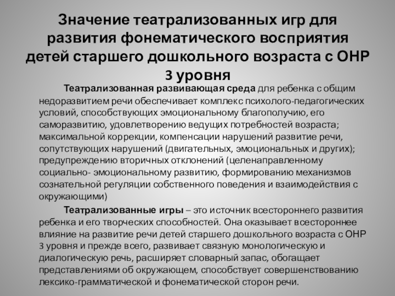 Театрализованные игры – это источник всестороннего развития ребенка и его творческих способностей. Она оказывает всестороннее влияние на развитие речи детей старшего дошкольного возраста с ОНР 3 уровня и прежде всего, развивает связную монологическую и диалогическую речь, расширяет словарный запас, обогащает представлениями об окружающем, способствует совершенствованию лексико-грамматической и фонематической сторон речи.