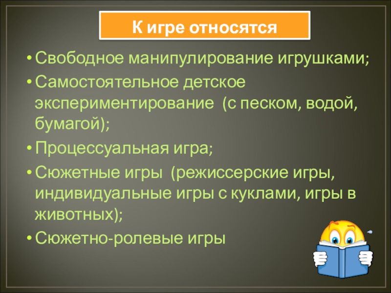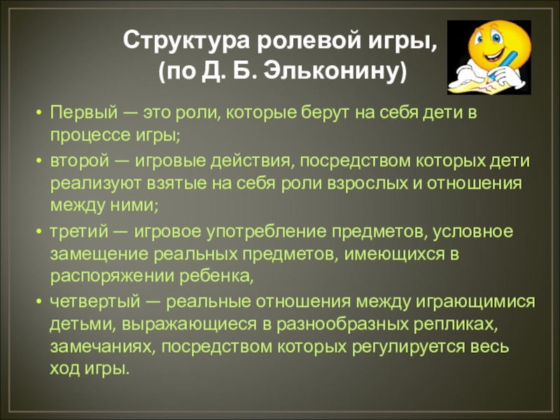 «исторически возникший вид деятельности детей, в котором воссоздаются социальные отношения между людьми, вне условий унитарной деятельности человека» Д. Б. Эльконин;