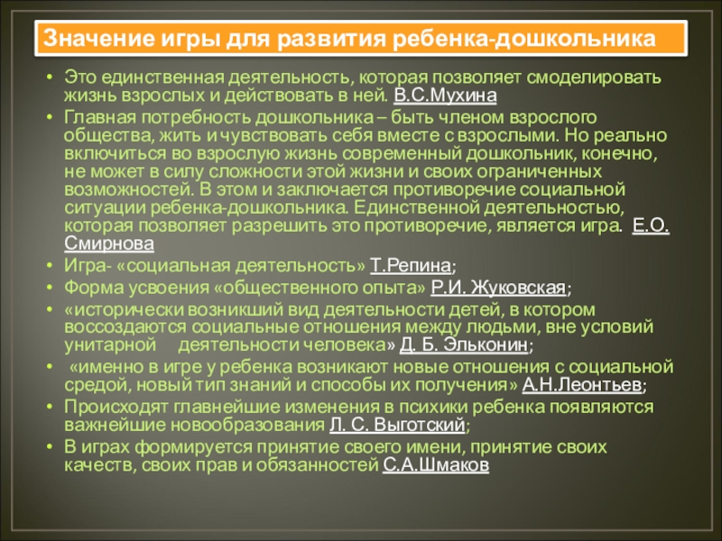 Огромное значение игры для развития всех психических процессов и личности ребенка в целом дает основание считать, что именно эта деятельность является в дошкольном возрасте ведущей.