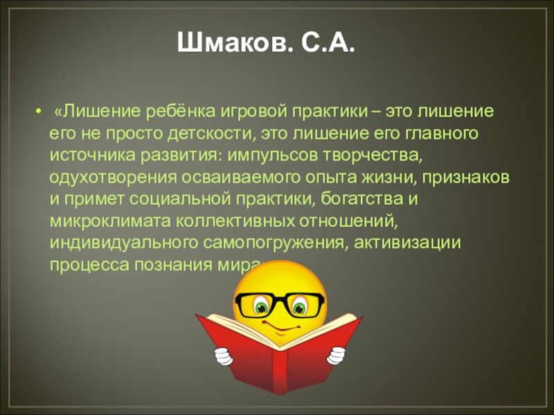 В играх формируется принятие своего имени, принятие своих качеств, своих прав и обязанностей С.А.Шмаков