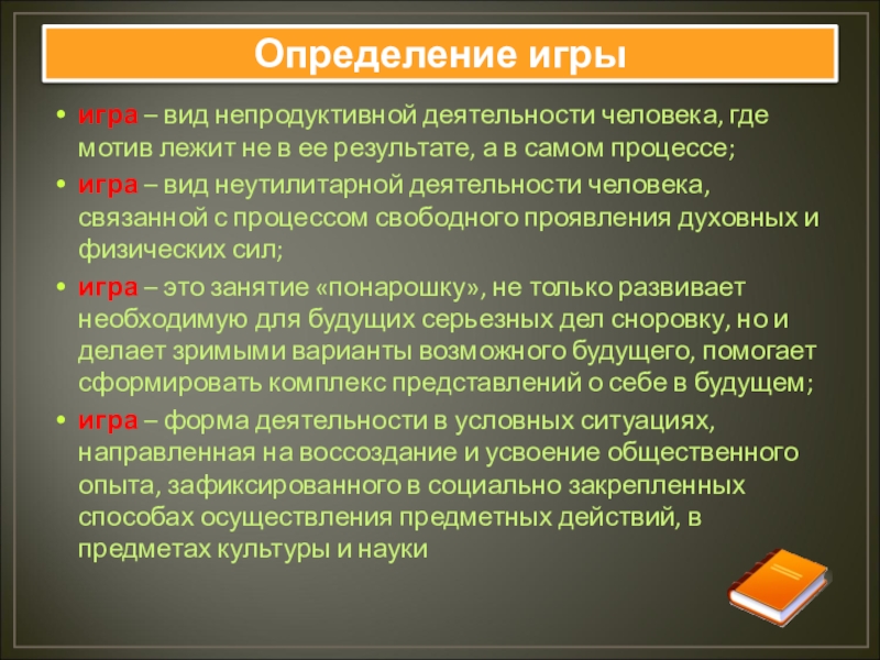 игра – вид неутилитарной деятельности человека, связанной с процессом свободного проявления духовных и физических сил;