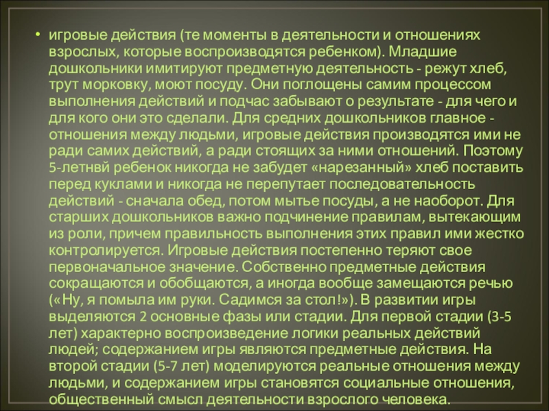 ребенком). Младшие дошкольники имитируют предметную деятельность - режут хлеб, трут морковку, моют посуду. Они поглощены самим процессом выполнения действий и подчас забывают о результате - для чего и для кого они это сделали. Для средних дошкольников главное - отношения между людьми, игровые действия производятся ими не ради самих действий, а ради стоящих за ними отношений. Поэтому 5-летнвй ребенок никогда не забудет «нарезанный» хлеб поставить перед куклами и никогда не перепутает последовательность действий - сначала обед, потом мытье посуды, а не наоборот. Для старших дошкольников важно подчинение правилам, вытекающим из роли, причем правильность выполнения этих правил ими жестко контролируется. Игровые действия постепенно теряют свое первоначальное значение. Собственно предметные действия сокращаются и обобщаются, а иногда вообще замещаются речью («Ну, я помыла им руки. Садимся за стол!»). В развитии игры выделяются 2 основные фазы или стадии. Для первой стадии (3-5 лет) характерно воспроизведение логики реальных действий людей; содержанием игры являются предметные действия. На второй стадии (5-7 лет) моделируются реальные отношения между людьми, и содержанием игры становятся социальные отношения, общественный смысл деятельности взрослого человека.