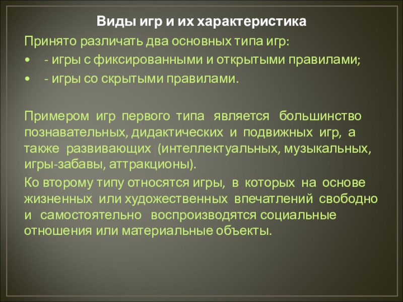 Примером игр первого типа является большинство познавательных, дидактических и подвижных игр, а также развивающих (интеллектуальных, музыкальных, игры-забавы, аттракционы).